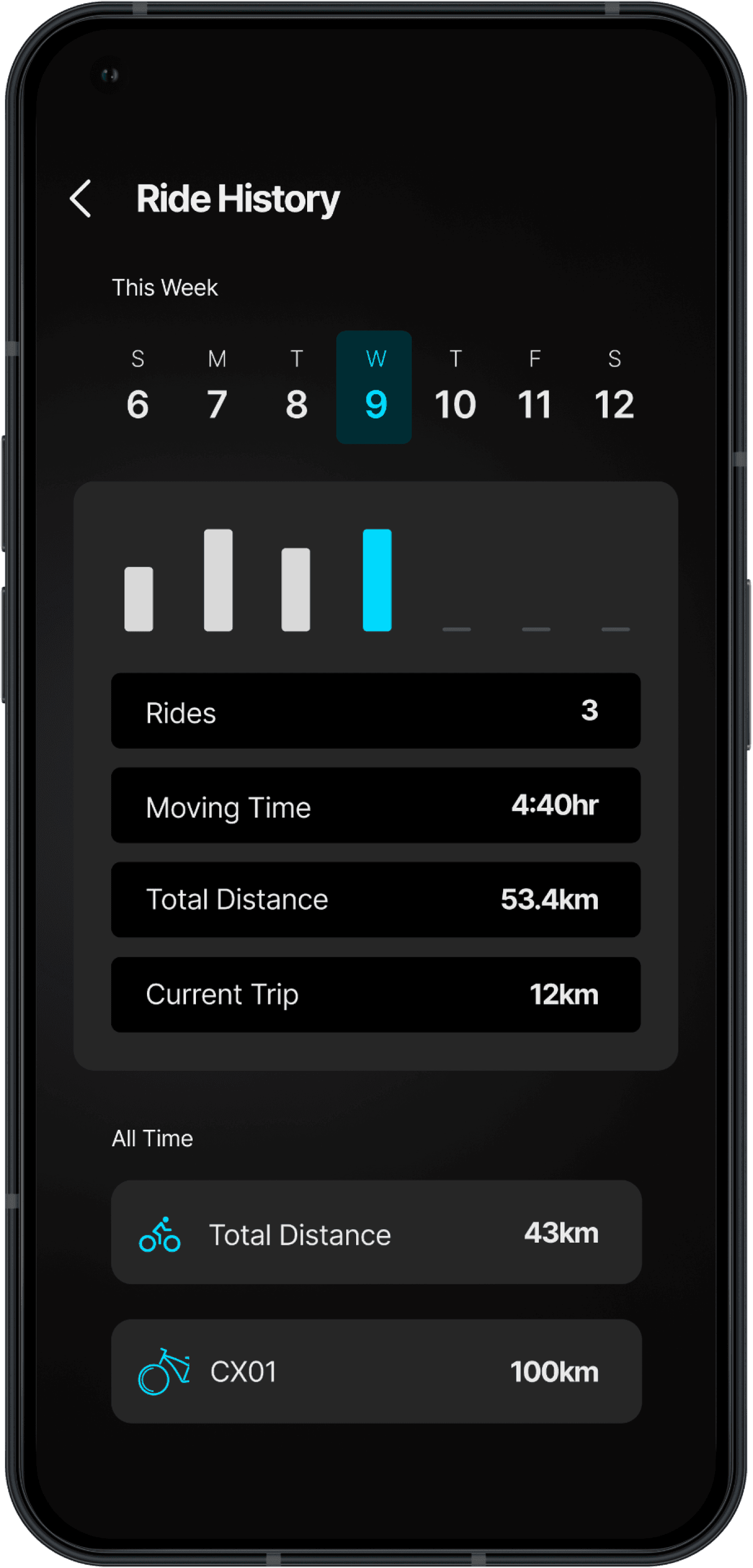 Providing users with a summary of their previous rides, based on Distance travelled and total duration. All these data will be personal to each user of the eBike. Can be scaled in the future.