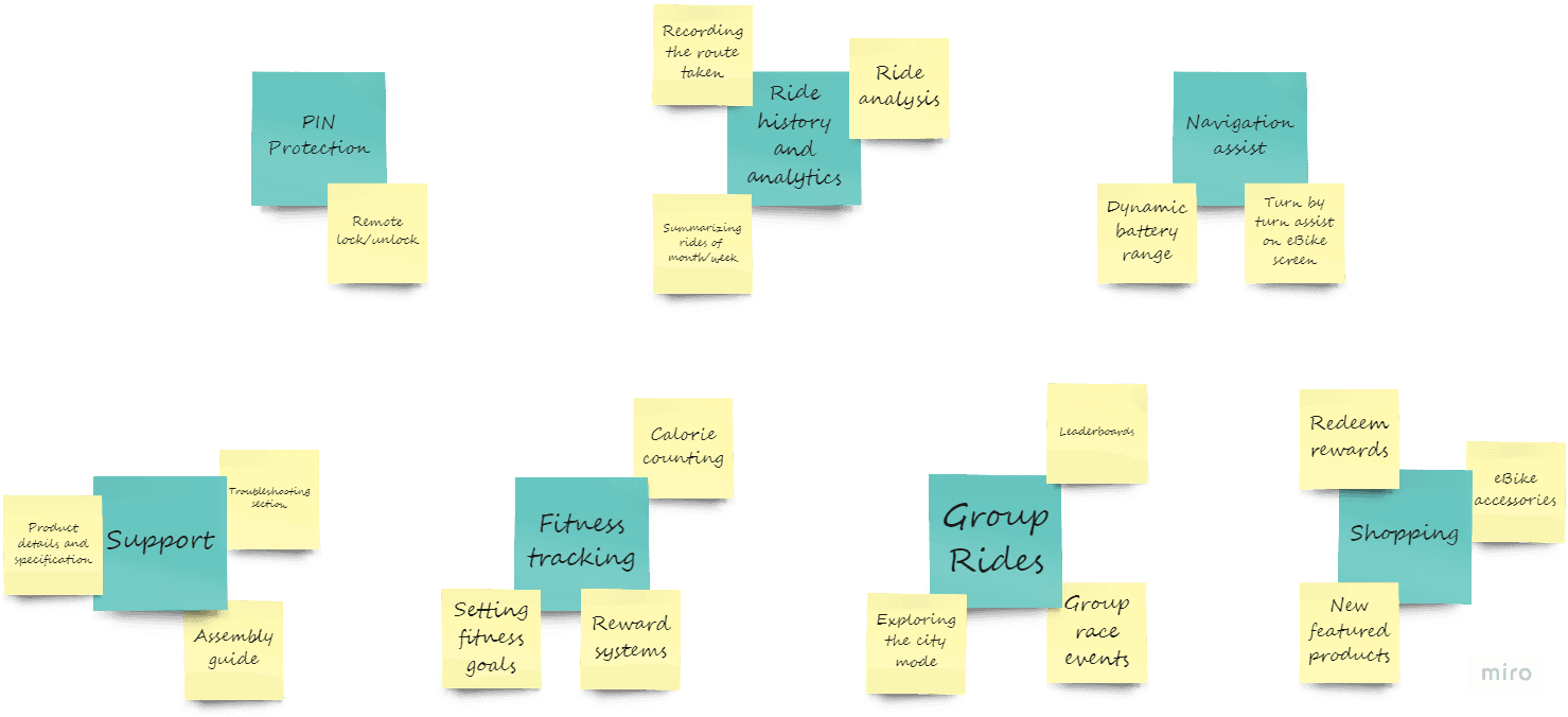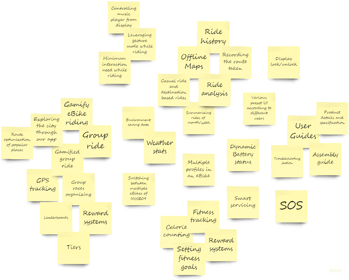 Coming up with features based on the capabilities of the NINE09 eBike, market standards and the areas defined from research.