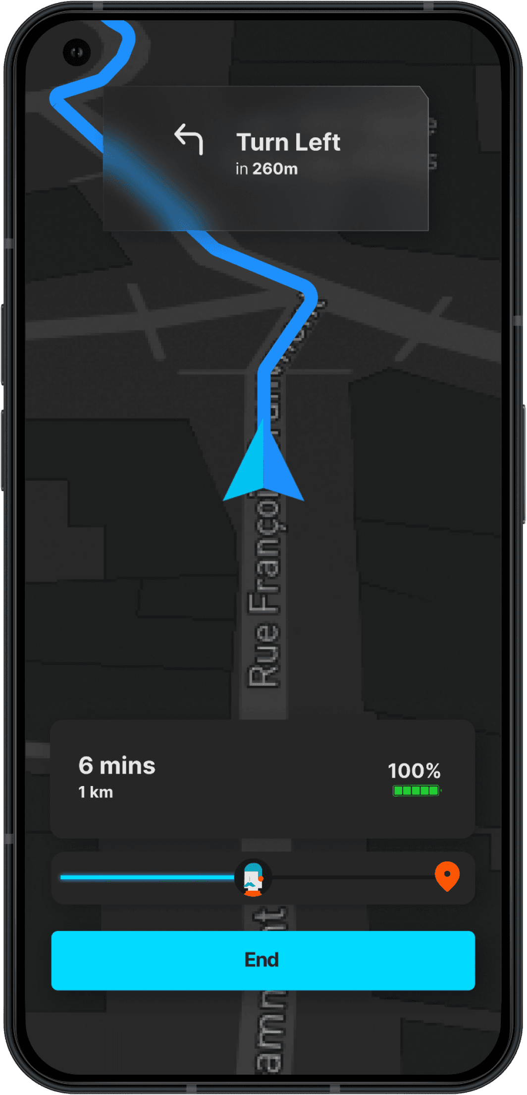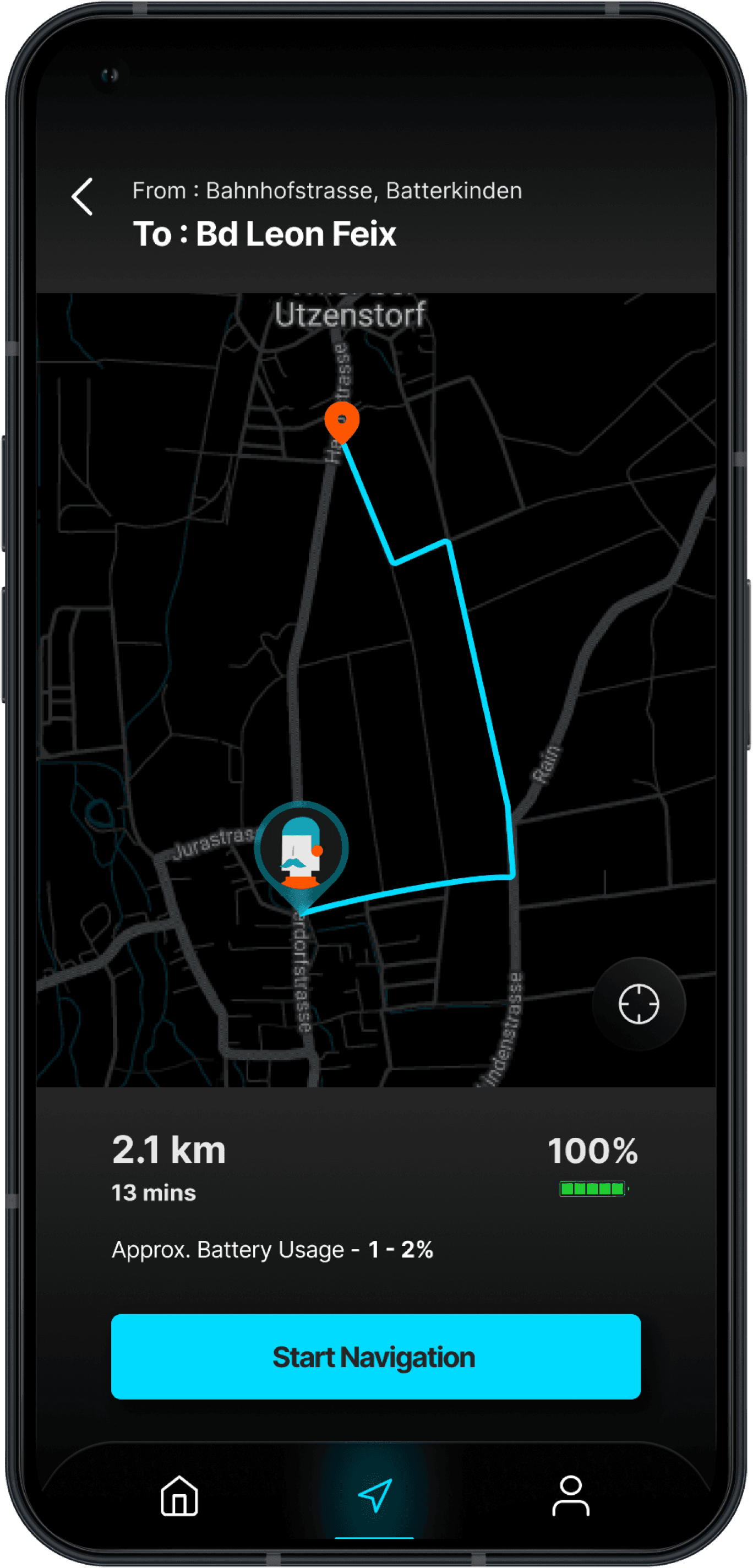 Turn by turn navigation assist will be initiated for the user on the eBike Screen once the user enters the start point and destination in the app.