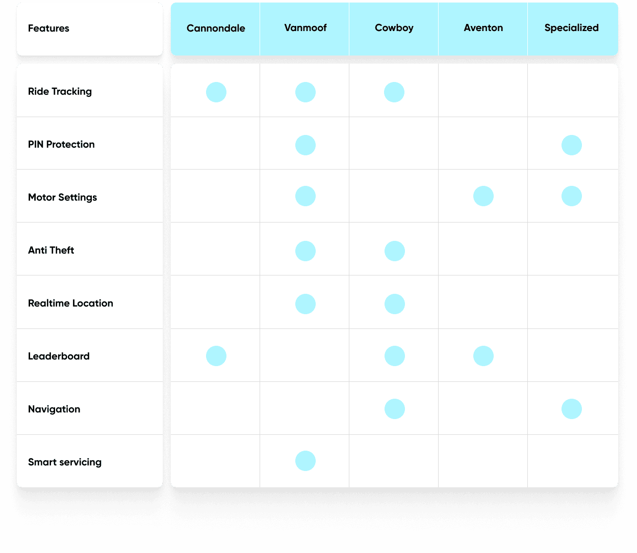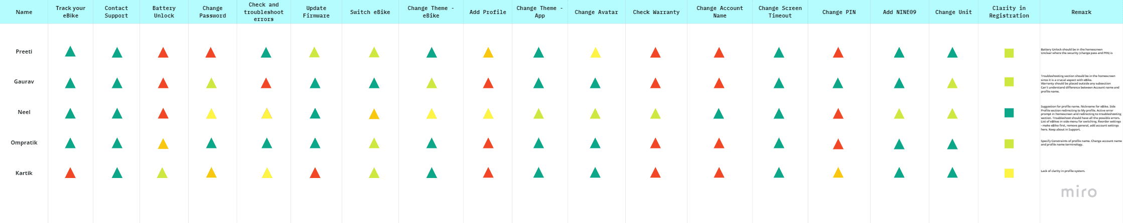 Once I was done with the competitive analysis, I got a much clearer view of what features are expected out of an eBike application and how other brands are providing them for their users. This provided me with the understanding of what kind of product is currently appreciated in the market, their shortcomings and where we can innovate and improve those features for our users.