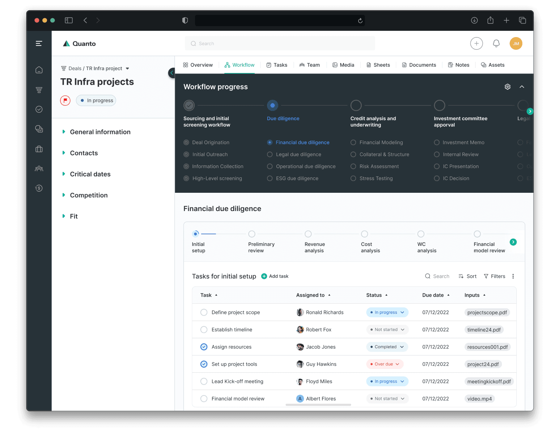 Build a feature where the PCM can easily create a set of processes in Quanto for each deal and assign tasks to their team member, track progress and deliver outputs on time.